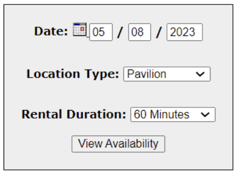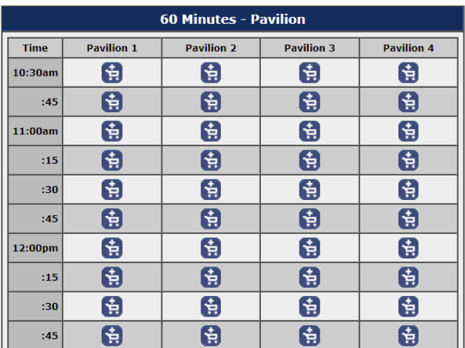 Click on the 'Shopping Cart' Symbol for the time and pavilion you would like to rent. This will add it into your shopping cart